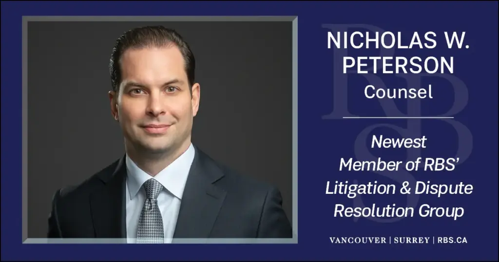 We welcome Nicholas W. Peterson to Litigation and Dispute Resolution group. As a seasoned litigator, Nick specializes in construction law, builder’s liens, commercial leasing, estate litigation, review hearings (Legal Profession Act), and personal injury with a focus on occupiers’ liability exclusively representing injury victims.